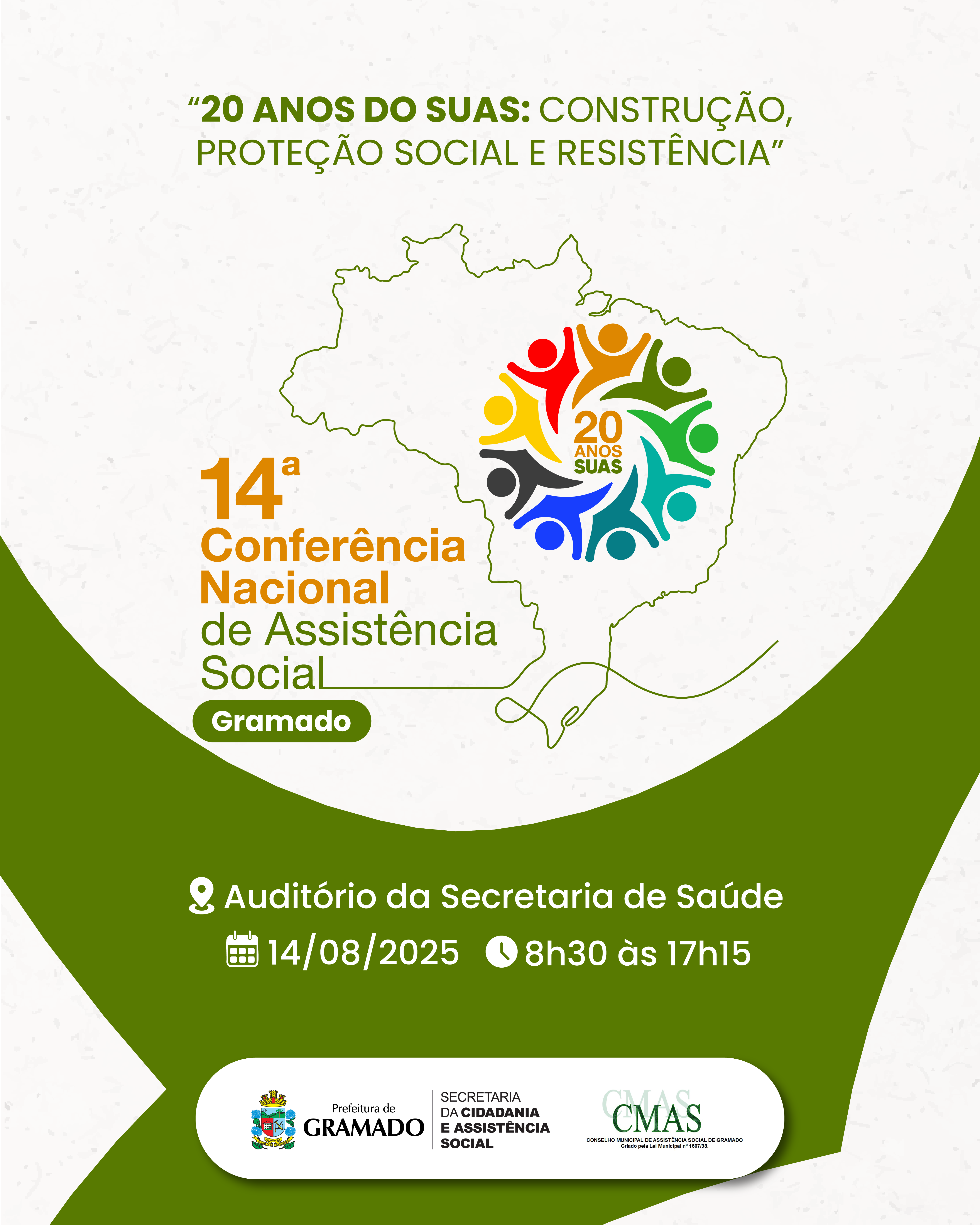 A Secretaria de Cidadania e Assistência Social de Gramado convida a população a participar da 14ª Conferência Municipal de Assistência Social. O evento, que é um espaço crucial para o diálogo e a construção das políticas públicas do setor, acontecerá no dia 14 de agosto de 2025, no Auditório da Secretaria Municipal de Saúde. A abertura da conferência está marcada para as 8h30, com previsão de encerramento às 17h15.