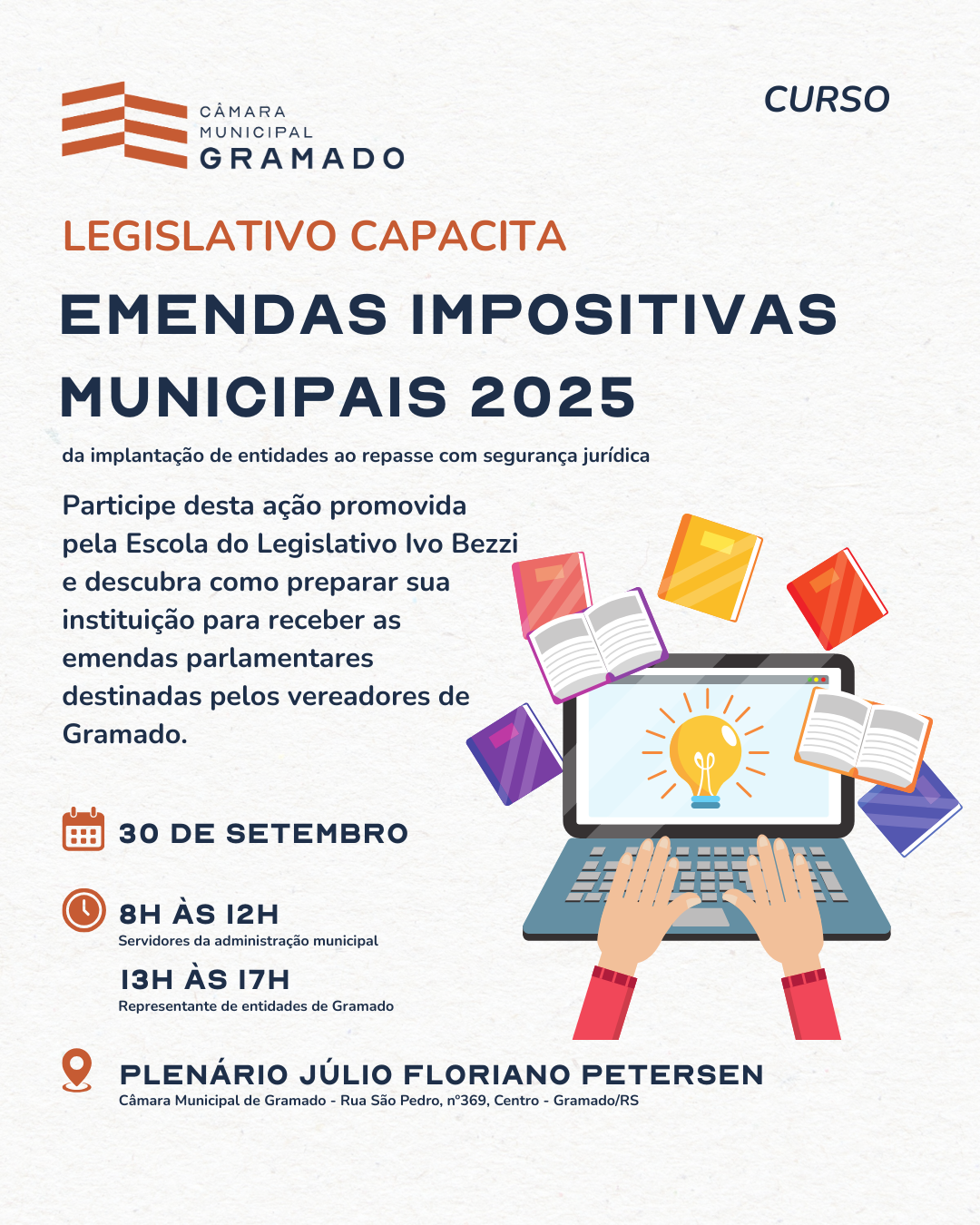 Manhã (8h às 12h): curso direcionado aos vereadores, assessores e servidores da Administração Municipal.