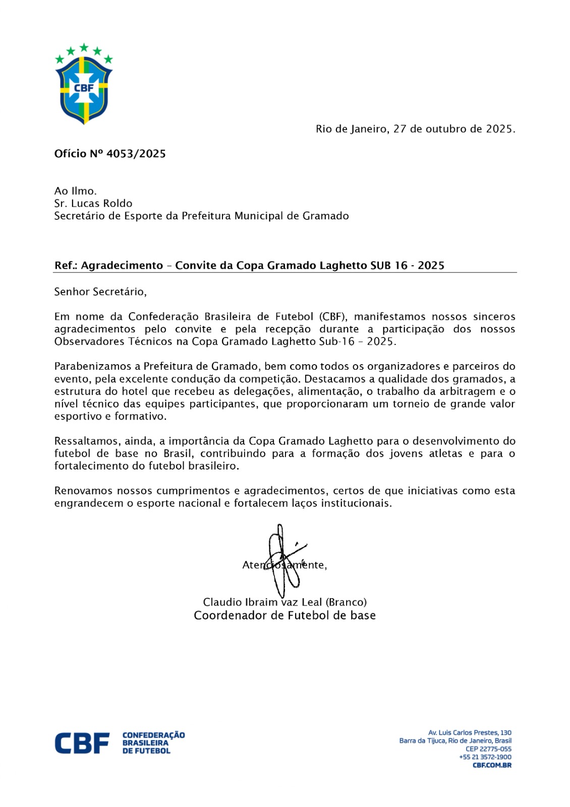 A Confederação Brasileira de Futebol (CBF) enviou um ofício de agradecimento à Secretaria de Esporte e Lazer de Gramado, reconhecendo a excelência da Copa Gramado Laghetto Sub-16 – 2025, realizada recentemente no município. No documento, assinado por Claudio Ibraim Vaz Leal (Branco), coordenador de futebol de base da CBF, a entidade parabeniza a Prefeitura de Gramado, os organizadores e parceiros do evento “pela excelente condução da competição”.