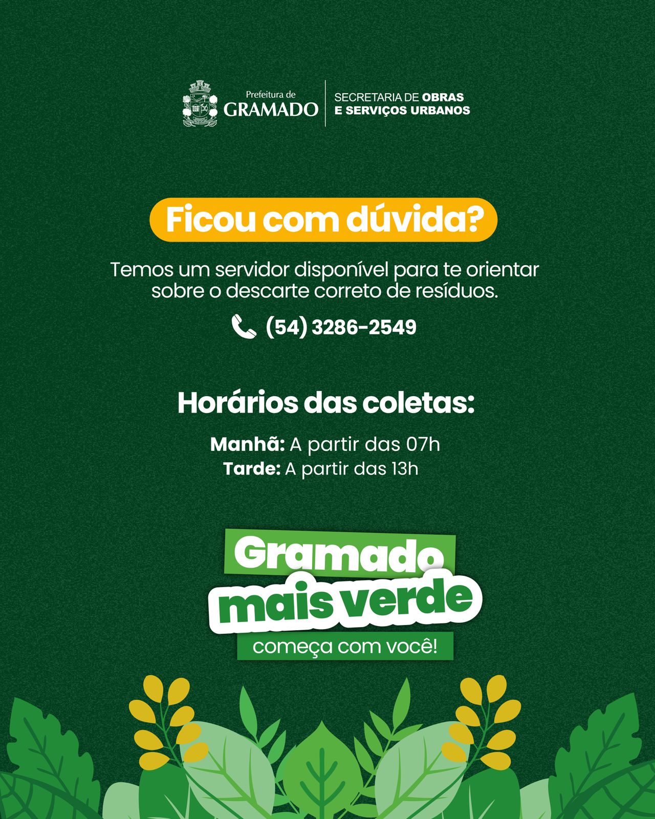 Fique atento aos dias de coleta em cada bairro e em caso de dúvidas, entre em contato pelos nossos canais de comunicação: (54) 3286-2549 – informações gerais; ou (54) 9.9981-2383 – agendamento para coleta de resíduos verdes ou móveis velhos.