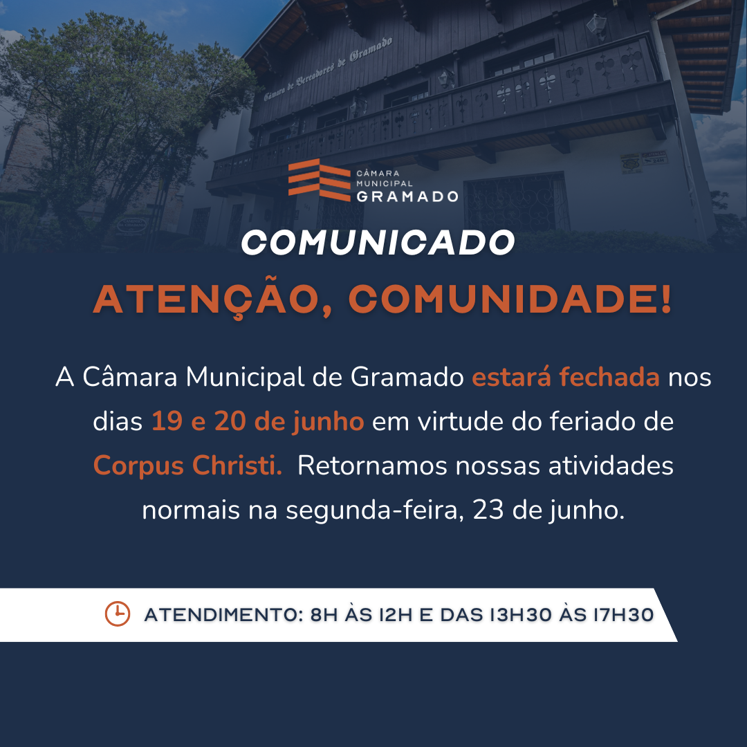 A Mesa Diretora da Câmara Municipal de Gramado informa que, conforme o Decreto Legislativo nº 001/2025 — em consonância com o Decreto Municipal nº 2116/2024, que estabelece o calendário oficial do município — a Casa do Povo permanecerá fechada nos dias 19 e 20 de junho, em razão do feriado de Corpus Christi e do ponto facultativo na sexta-feira, respectivamente.
