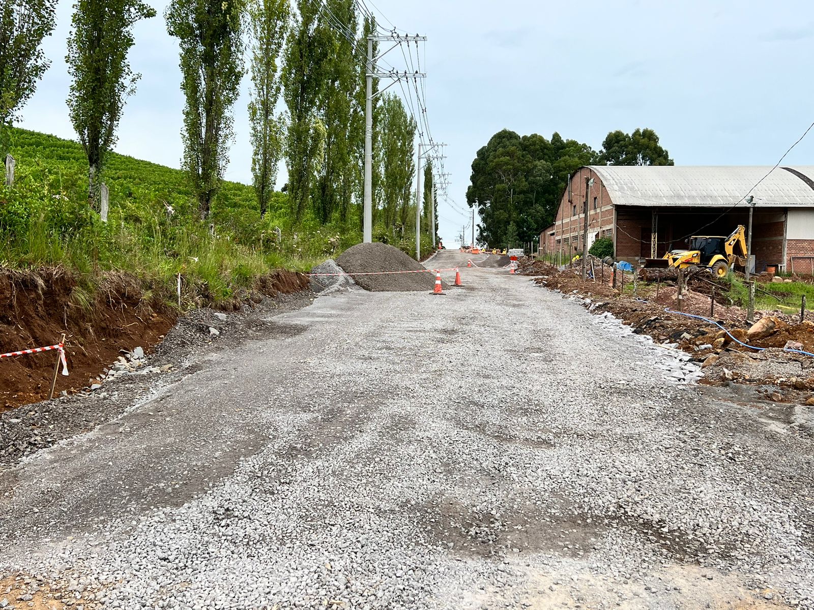 Com recursos próprios do município, a Administração Pública, por meio da Secretaria de Obras e Serviços Urbanos, trabalha para levar 1,4 quilômetros de asfalto para a rua de acesso à Vinícola Ravanello, na RS 235.