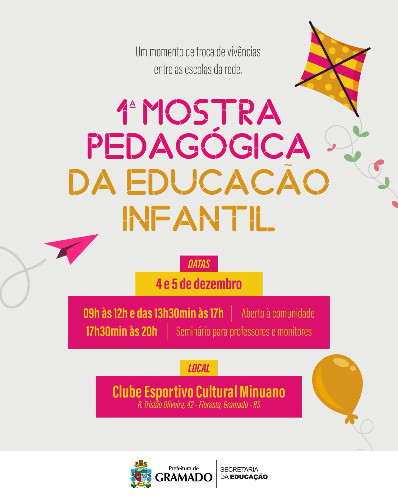 Para compartilhar ainda mais práticas entre os professores e a comunidade, o município realizará a 1ª Mostra Pedagógica da Educação Infantil, que acontecerá nos dias 4 e 5 de dezembro, no Clube Esportivo Minuano, em Gramado.