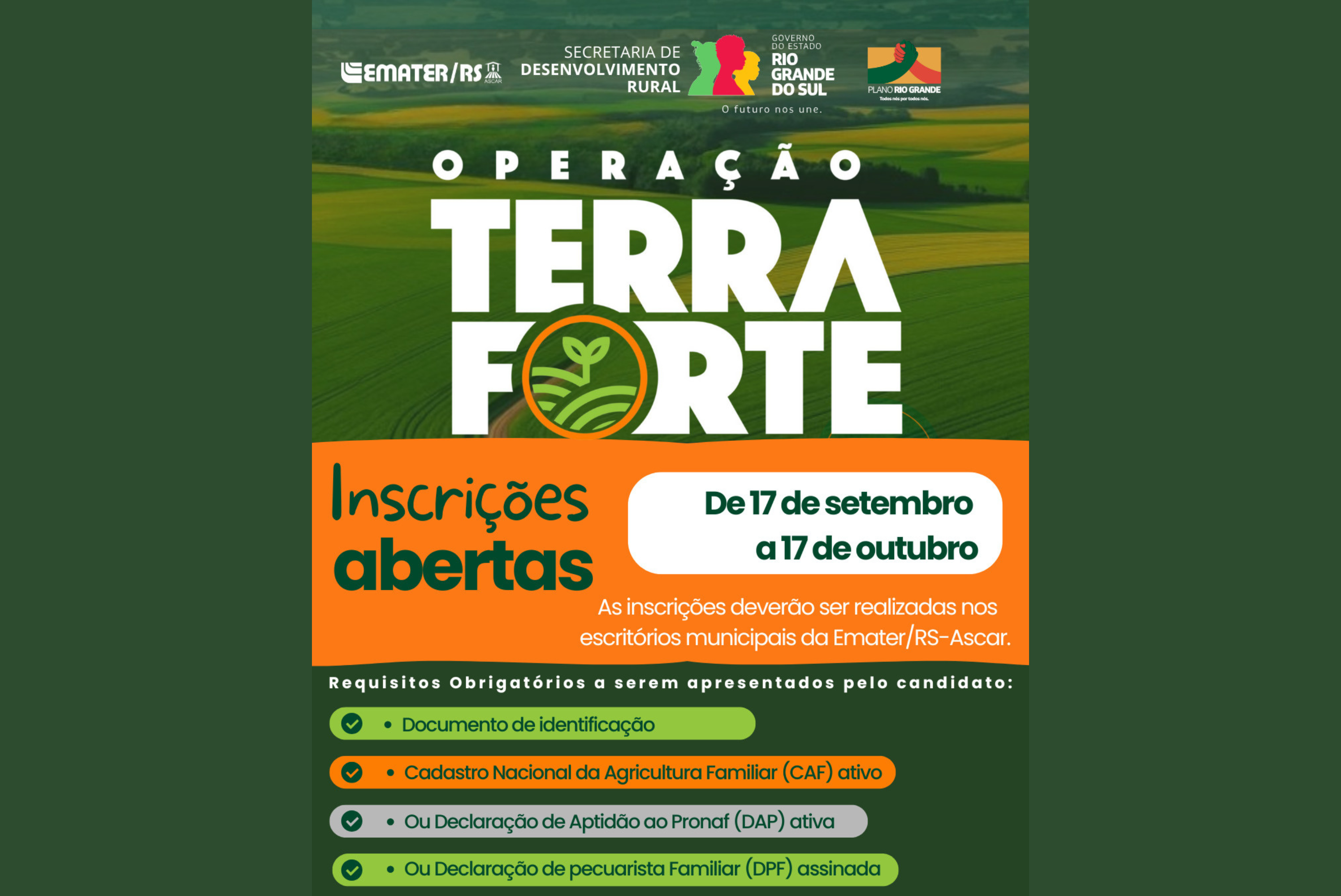 O Programa Operação Terra Forte é promovido pelo Governo do Estado do Rio Grande do Sul, por meio da Secretaria de Desenvolvimento Rural, em parceria com a Emater/RS-Ascar, e integra o Plano Rio Grande. A ação tem como objetivo fortalecer a agricultura familiar, apoiar os produtores rurais e ampliar a sustentabilidade no campo, contribuindo para o desenvolvimento das comunidades gaúchas.