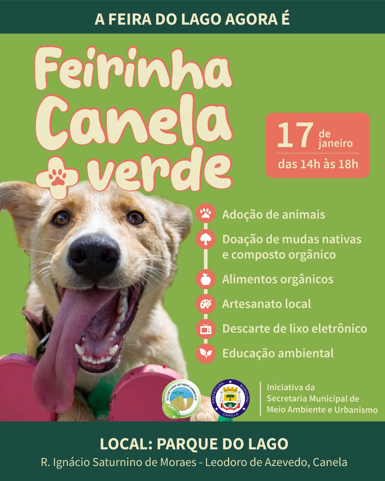 O evento também terá feira de adoção de animais, organizada pelo Centro Municipal de Proteção aos Animais (Cempra), incentivando a adoção responsável. Em caso de chuva, a Feira Canela + Verde será cancelada.