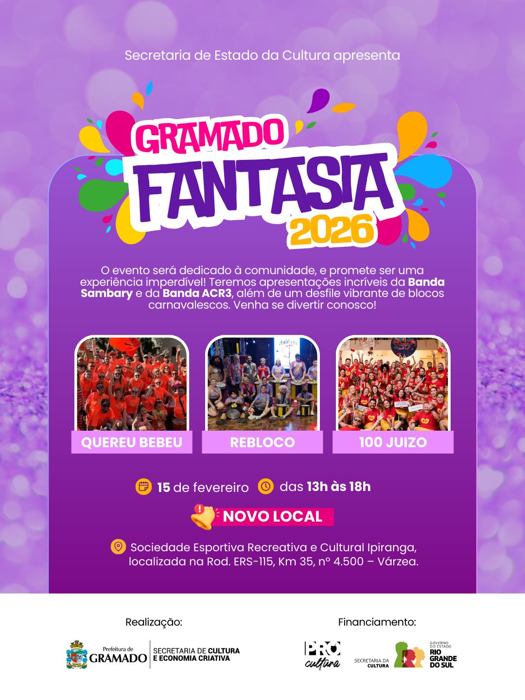 A Secretaria de Cultura e Economia Criativa informa que a programação de carnaval do Gramado Fantasia, que estava prevista para ser realizada no domingo a tarde (15), no Espaço Criativo do Lago Joaquina Rita Bier, foi transferida para o Clube Ipiranga da Várzea Grande, em virtude da previsão de chuva. As atrações, com apresentações das bandas Sambary e ACR3, além do desfile dos blocos carnavalescos Sem Juízo, Quereu Bebeu e Rebloco, ocorrem das 13h às 18h, com acesso gratuito para o público.