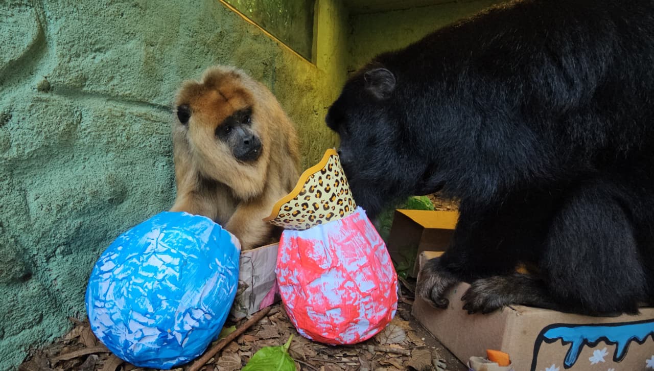 Também teve festa para a família de bugios-pretos, que ganharam bolo, caixas de presente e balões de papelão recheados com frutas, legumes e folhas. “Também usamos uma bola cognitiva de papelão com ração. Os machos interagiram primeiro, mas as fêmeas e filhotes também participaram. “O objetivo do programa é o bem-estar animal. Quanto mais tempo os bichos passam interagindo com os objetos, melhor é o resultado”, afirma a bióloga