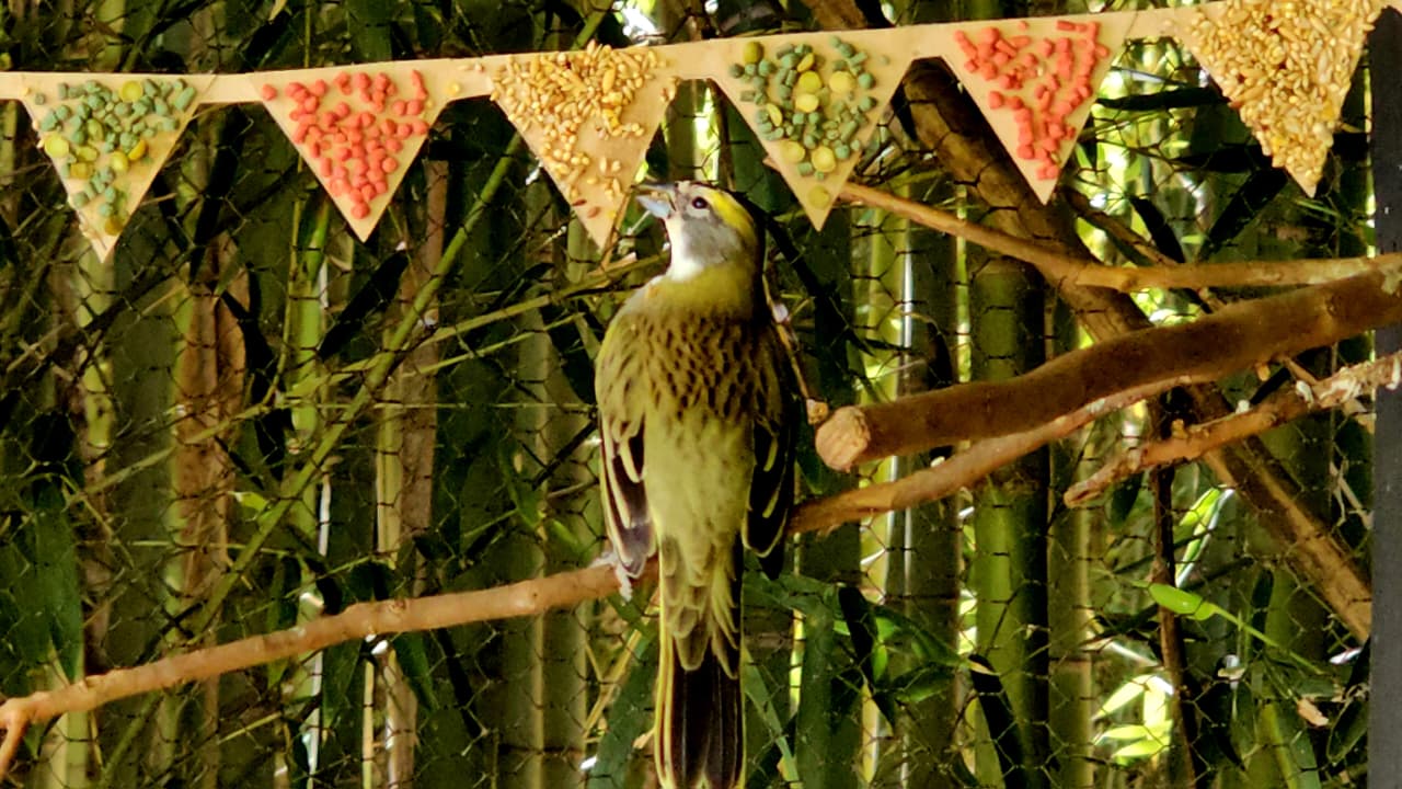Já no recinto do cardeal-amarelo, ave ameaçada de extinção, a equipe colocou bandeirolas com as cores do Rio Grande do Sul. “Usamos ração extrusada, sementes e grãos das cores verde, amarela e vermelha e cola natural para fixar”, conta.