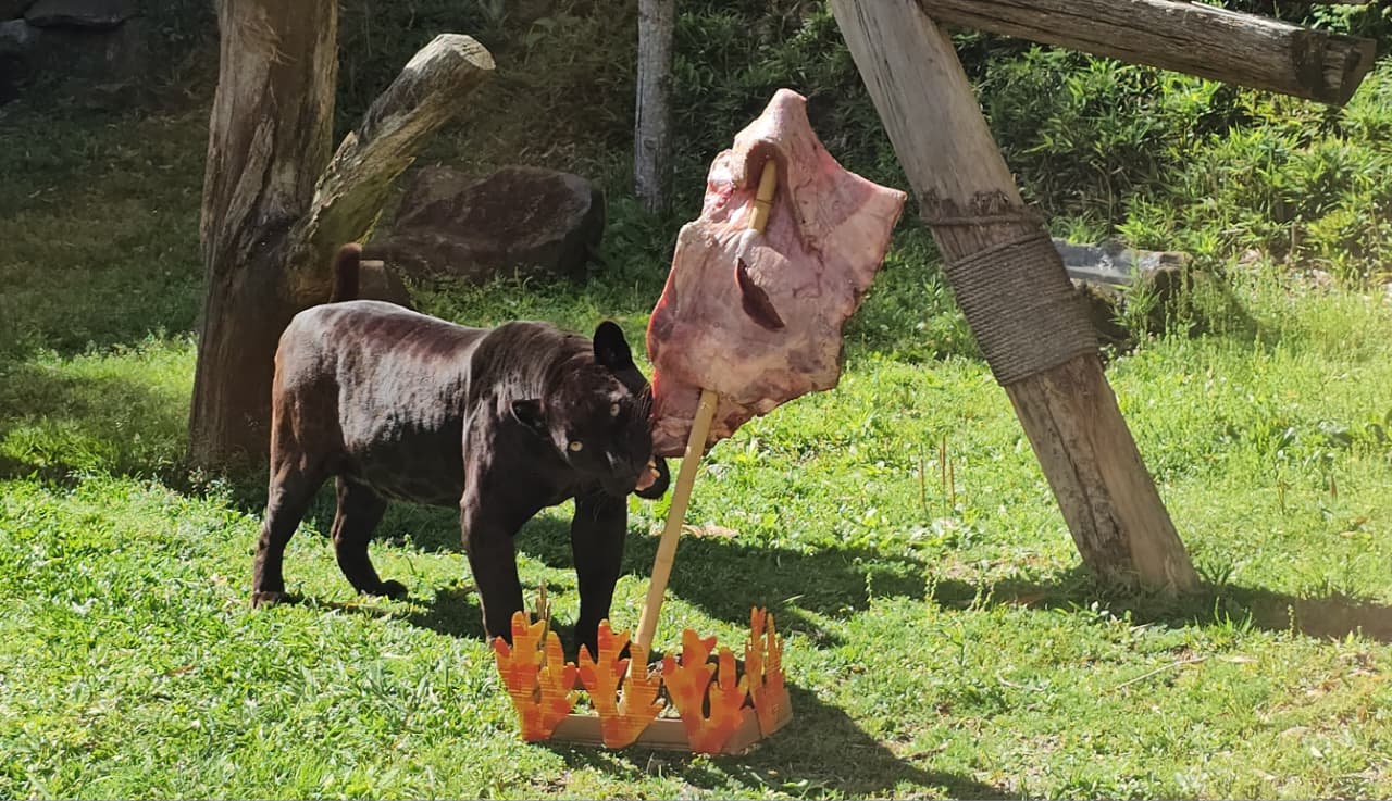 O Dia do Gaúcho é sempre de comemoração em dose dupla no Gramadozoo, Inaugurado em 20 de setembro de 2008, o parque está completando 17 anos e, para celebrar, a equipe técnica prepara enriquecimentos ambientais com a temática das duas datas. O puma e a onça-preta fizeram a festa com um autêntico costelão gaúcho. Enquanto o puma recebeu a carne dentro de um bolo cenográfico de papelão, a onça-preta devorou a costela no espeto de chão. “Além do bolo, o recinto do puma recebeu balões e caixas de presente de papelão recheadas com carne e capim”, explica a bióloga Tathiana Gosaric, responsável pelas atividades.