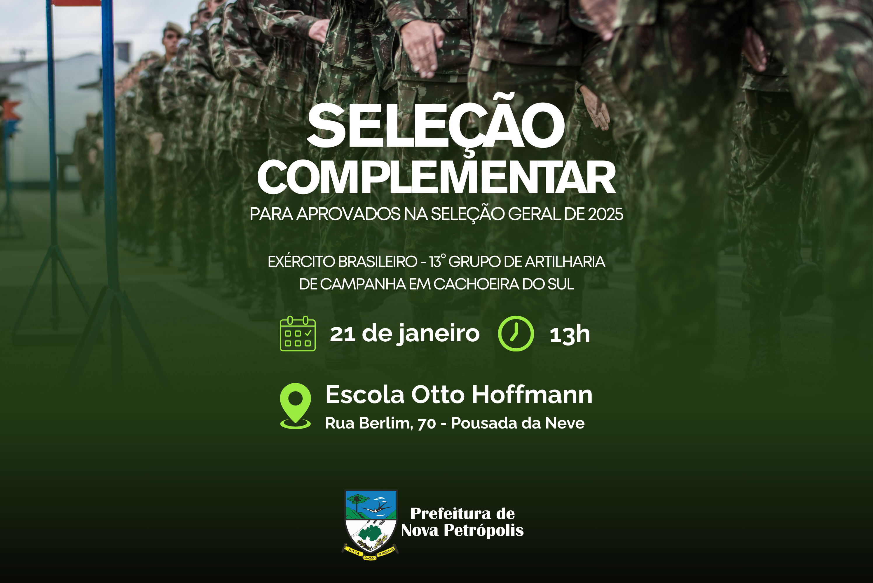 No dia 21 de janeiro, quarta-feira, às 13h, na Escola Municipal de Ensino Fundamental Otto Hoffmann (Rua Berlim, nº 70, Pousada da Neve), ocorre a etapa final de avaliação para jovens designados após o alistamento militar de 2025. Nessa etapa, os jovens passarão por uma entrevista, avaliação física e inspeção médica e odontológica.