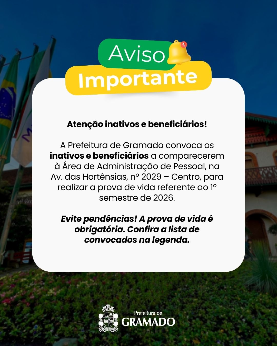 Município de Gramado convoca inativos e beneficiários para realização de prova de vida até 15 de fevereiro