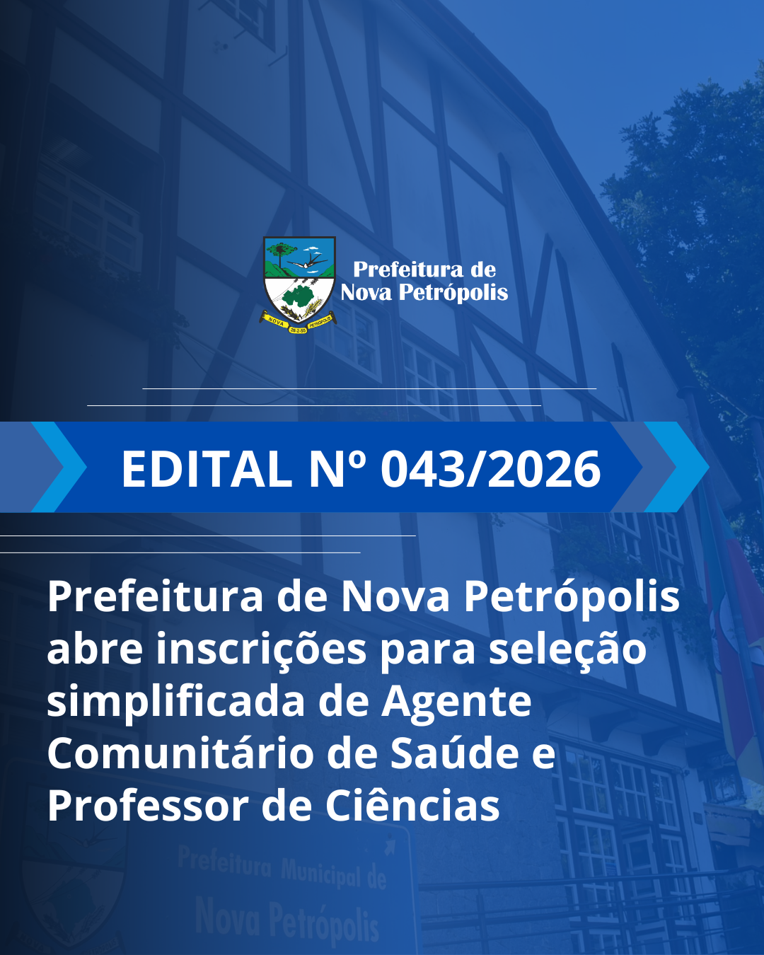A Prefeitura de Nova Petrópolis está com inscrições abertas para Processo Seletivo Simplificado destinado à contratação emergencial e por tempo determinado para os cargos de Agente Comunitário de Saúde – ESF Piá e Professor de Ciências. As inscrições ocorrem de 6 a 12 de março, exceto sábado e domingo, e devem ser feitas presencialmente no Setor de Protocolo da Prefeitura Municipal, na Rua Sete de Setembro, nº 330, 2º andar, no Centro, das 8h30 às 11h30 e das 13h30 às 16h30.