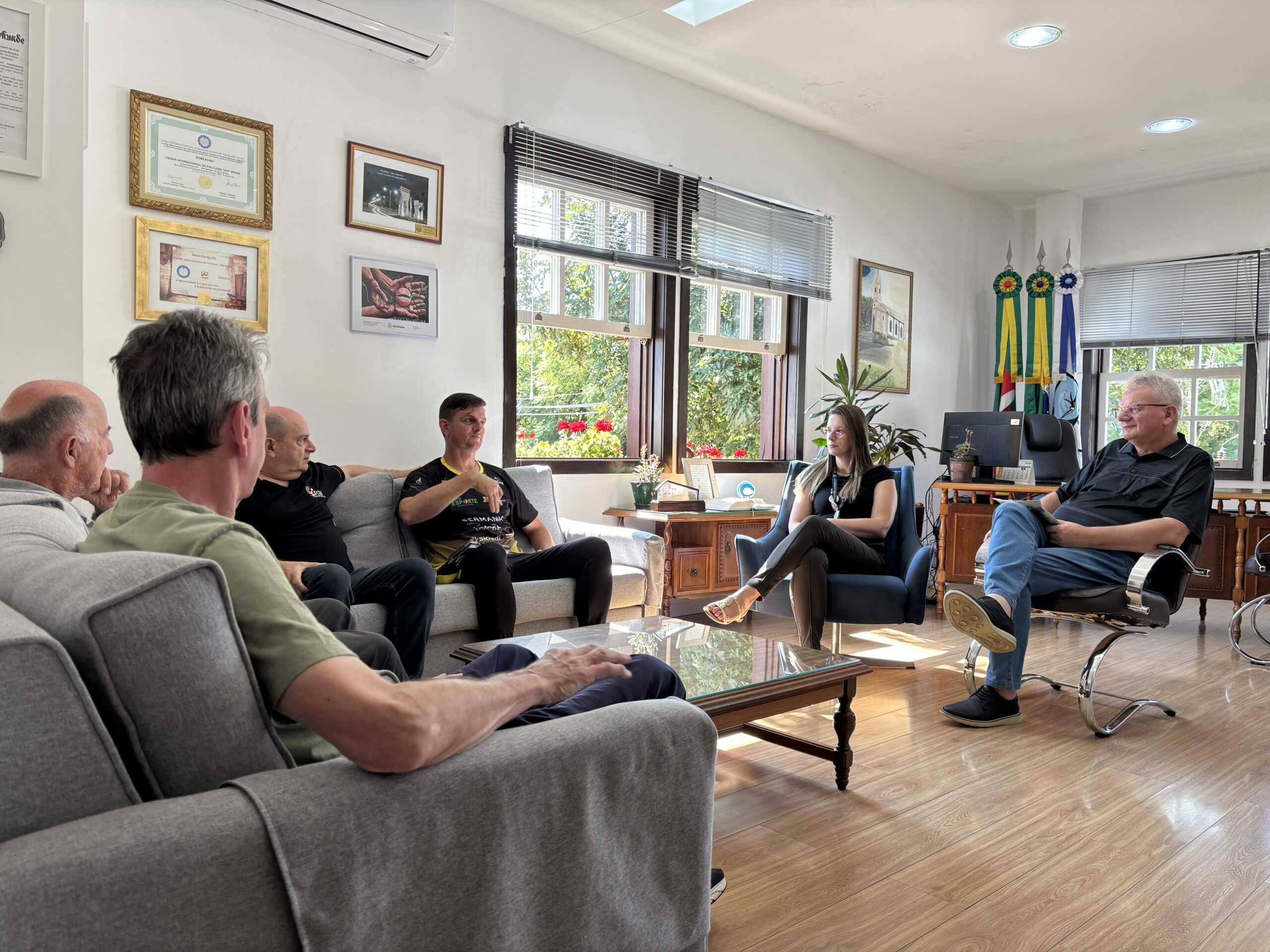 O prefeito de Nova Petrópolis, Daniel Carlos Michaelsen, recebeu na manhã desta quinta-feira,2 de abril, no Gabinete Oficial, a Comissão do Dia Estadual do Vôlei, para discutir as novidades da 10ª edição do evento. Participaram da reunião a secretária adjunta de Educação e Desporto, Carmen Bürke Pooch; o diretor do Departamento de Atividades de Educação Desportiva de Nova Petrópolis, Luiz André Port; o presidente da Federação Gaúcha de Voleibol (FGV), Carlos Alberto Cimino; o diretor de Arbitragem da FGV, Mauro Engelke; e o coordenador do Projeto Vôlei Nova Petrópolis, Fábio Roese.