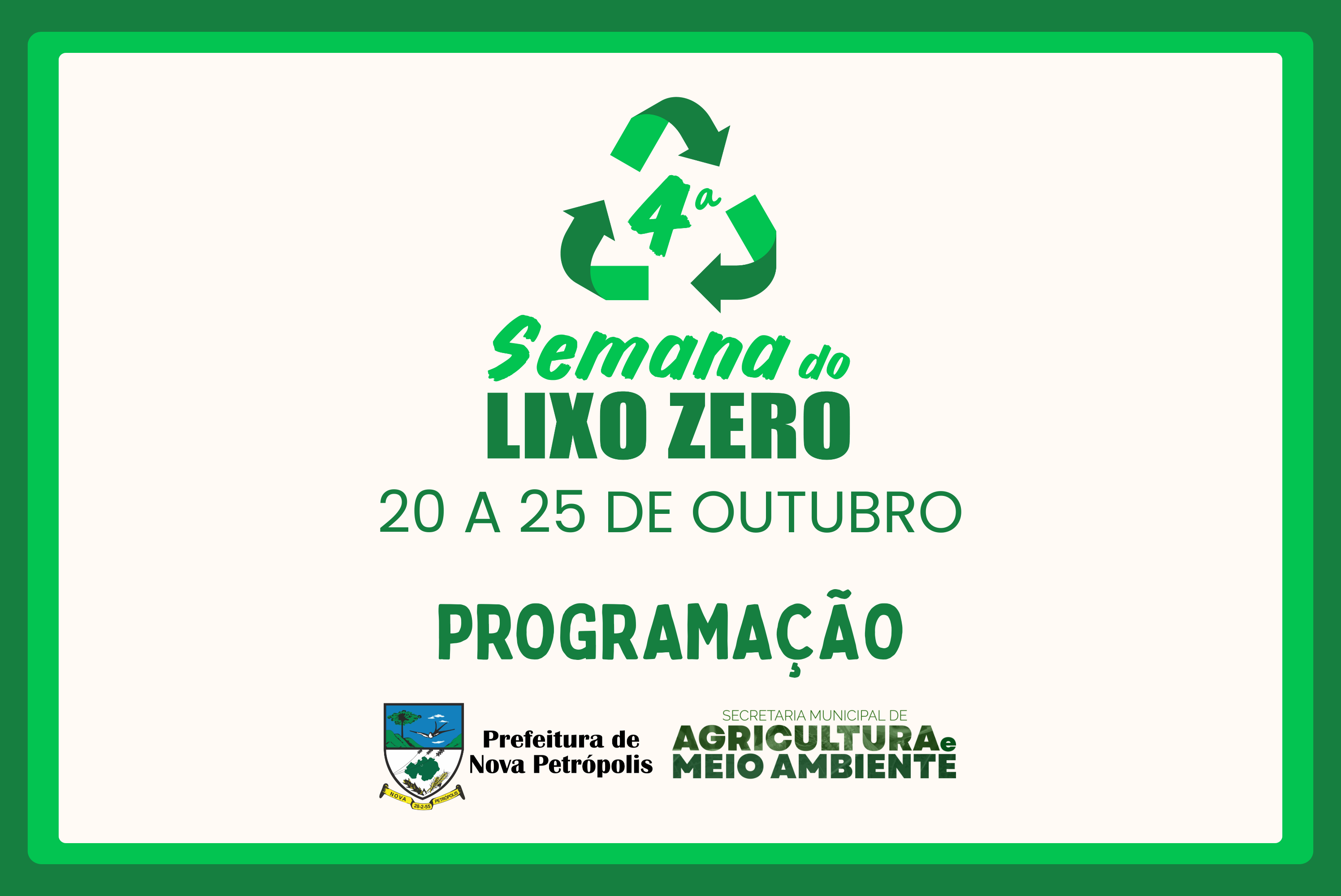 Durante os dias 20 e 25 de outubro, a Prefeitura de Nova Petrópolis, por meio da Secretaria Municipal de Agricultura e Meio Ambiente, promove a 4ª Semana do Lixo Zero, uma iniciativa de caráter ambiental que visa incentivar a reflexão da população sobre a geração e destinação correta do lixo. A iniciativa contará com programações nas escolas do Município e para a população em geral.