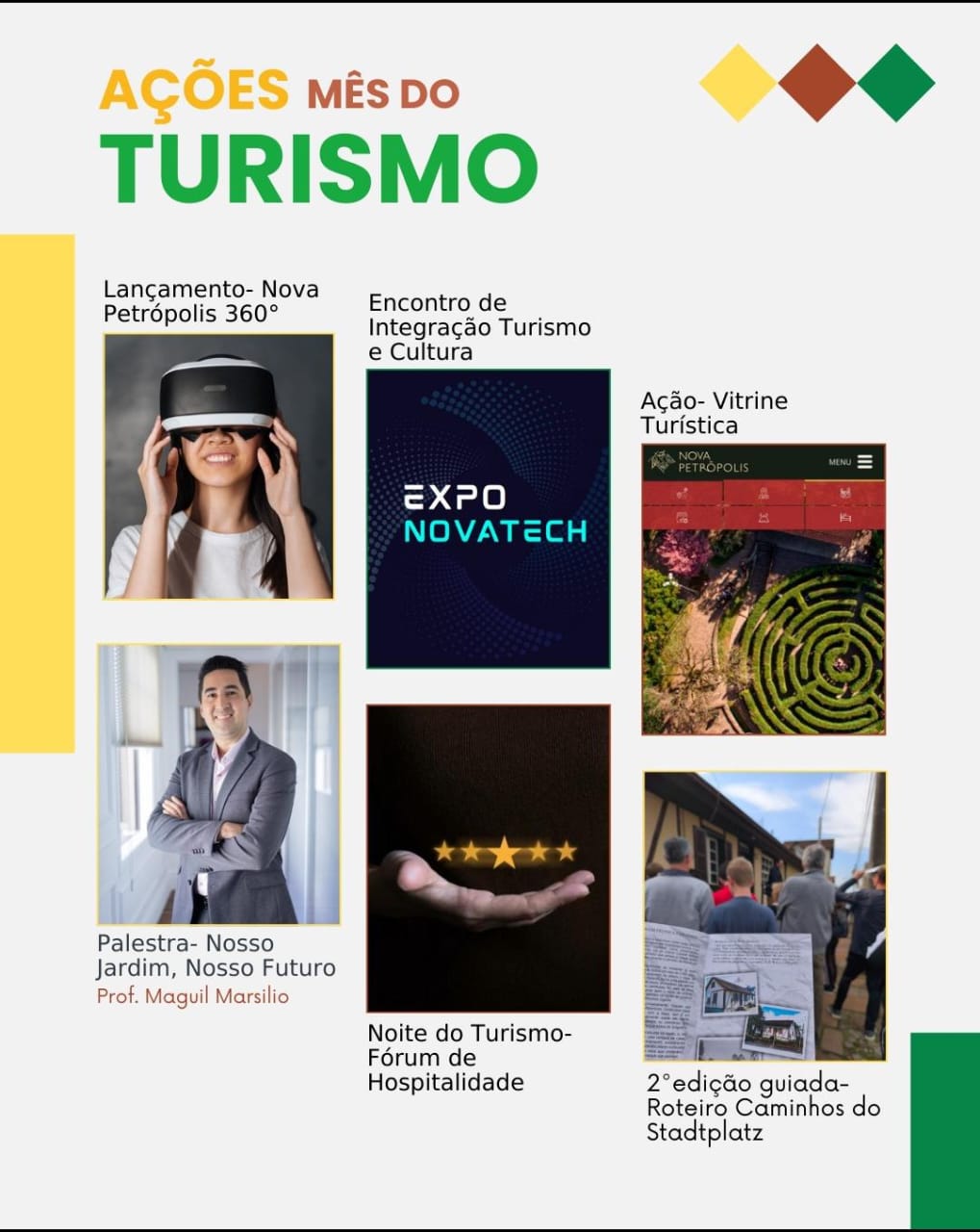 A agenda inicia nos dias 11 e 12 de setembro, durante a Exponovatech, com o Encontro de Integração Turismo e Cultura marcado para o dia 11, às 19h, no espaço da feira. Também na Exponovatech, no mesmo dia, acontece o lançamento oficial do Tour Virtual Nova Petrópolis 360°, ferramenta que proporcionará uma nova forma de conhecer os atrativos turísticos da cidade.