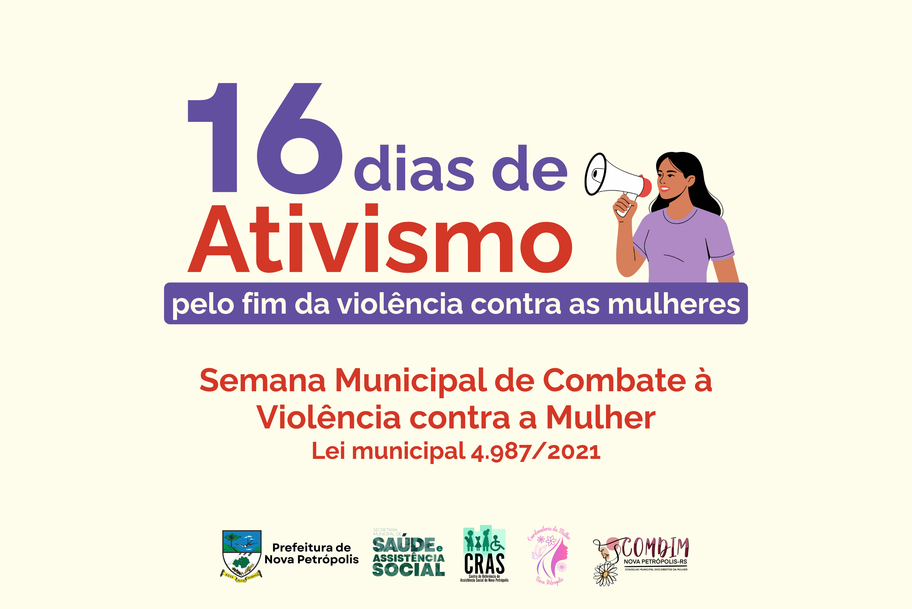 Entre os dias 24 de novembro e 10 de dezembro, Nova Petrópolis realiza a campanha “16 Dias de Ativismo pelo Fim da Violência Contra a Mulher”. A Secretaria de Saúde e Assistência Social, através do Centro de Referência de Assistência Social (CRAS); do Centro de Referência Especializado de Assistência Social (CREAS) e da Coordenadoria da Mulher, promoverá ações no Município.