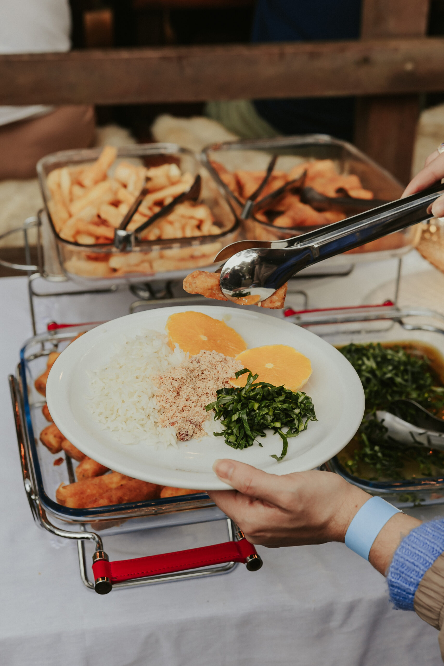 – Acompanhamentos – couve refogada, mandioca frita, torresmo, pão caseiro, arroz branco, farofa, banana à milanesa e laranja.