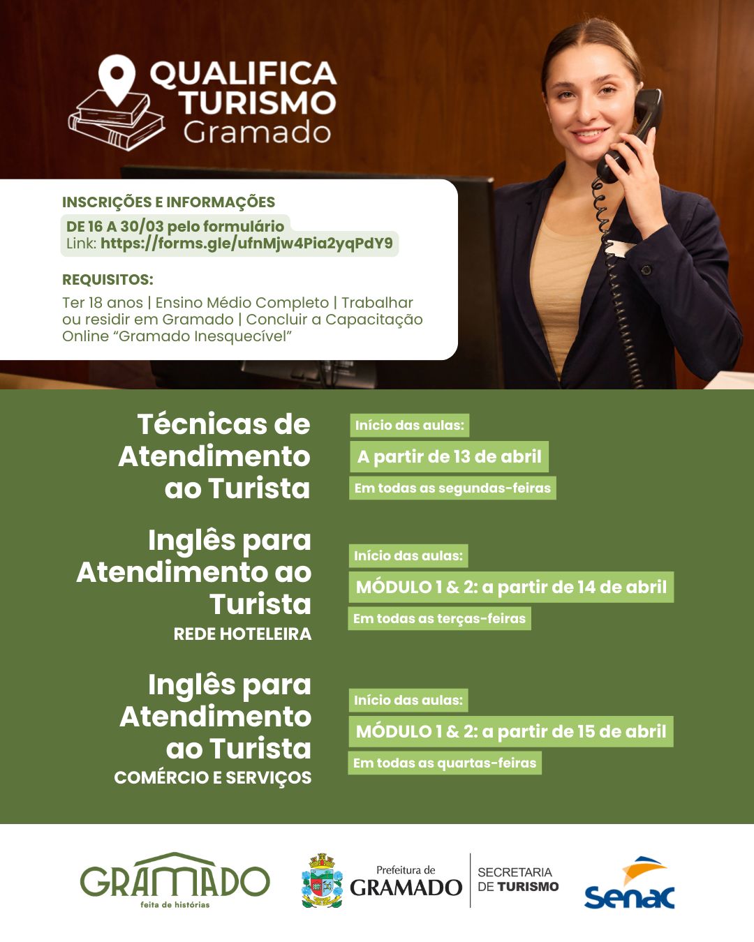 Todos os cursos são gratuitos e voltados a maiores de 18 anos com ensino médio completo e vínculo com o município de Gramado. As inscrições devem ser realizadas pelo link: https://forms.gle/iJx8sQVow48q13kS9 .