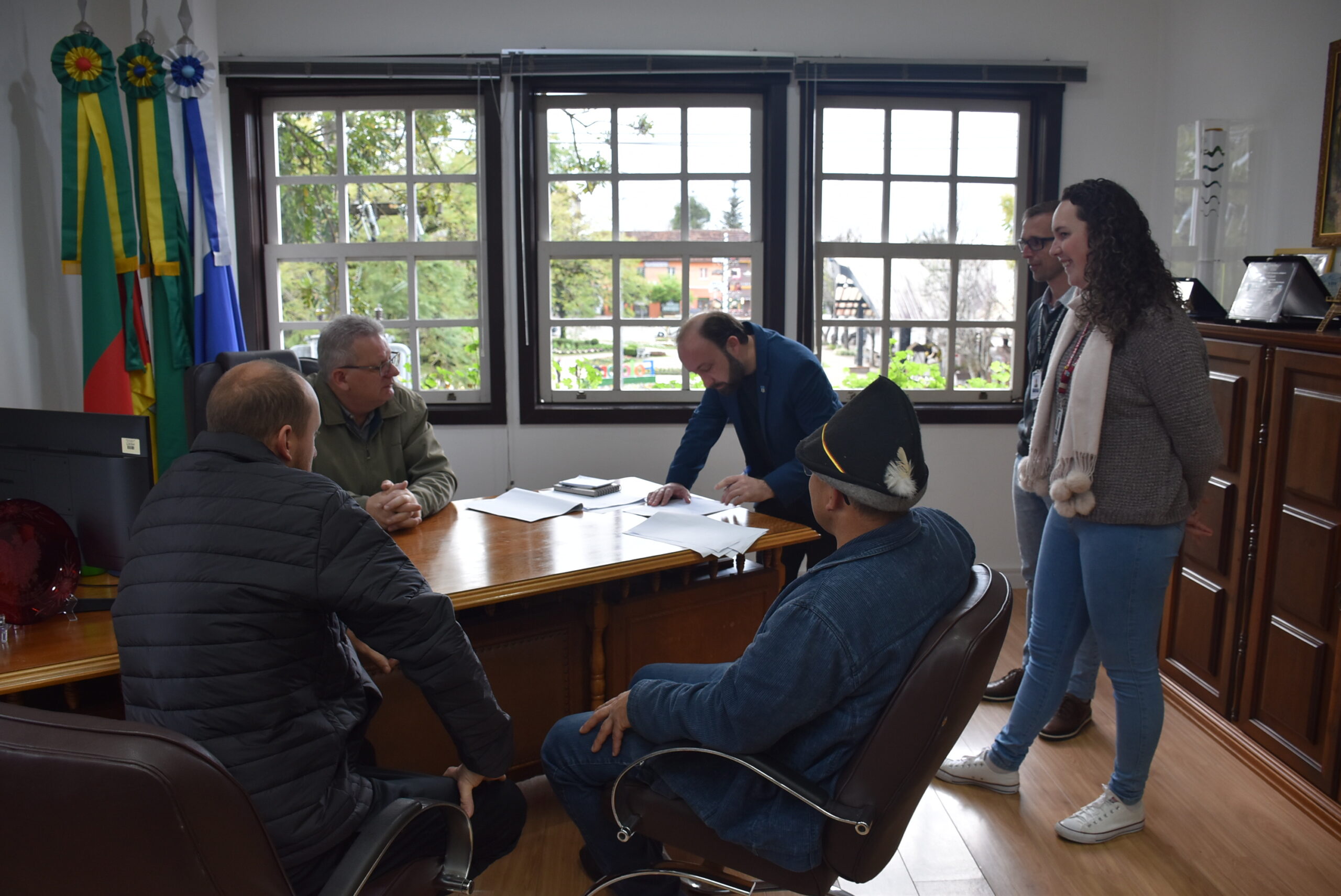 O secretário Municipal de Administração, Paulo Marcos Schwantz; o secretário Municipal de Turismo e Cultura, Rodrigo Barbieri Sangali; a diretora de Eventos Culturais de Nova Petrópolis, Eduarda Munize Papke; e o coordenador do 20º Kerb im Tannenwald, Clodomiro Fernandes, também participaram do ato de assinatura do documento.