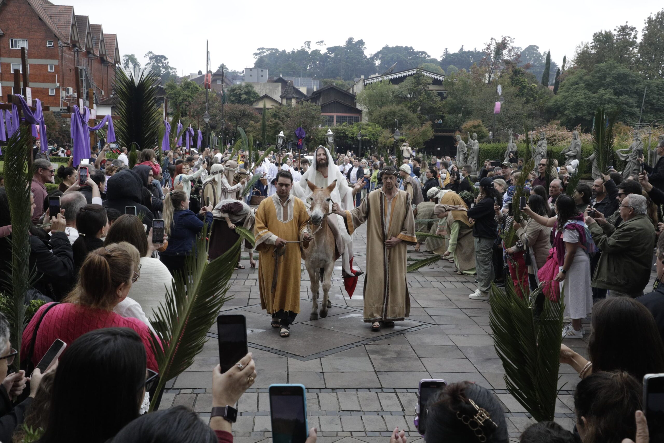 O Domingo de Ramos e da Paixão de Cristo será celebrado com a tradicional Procissão de Ramos pela avenida Borges de Medeiros. O rito litúrgico faz parte da programação do Gramado Aleluia e marca a abertura da Semana Santa em Gramado. Na Procissão de Ramos, que ocorre neste domingo (29), um elenco de 35 atores encena passagens da vida de Jesus Cristo até a entrada triunfal em Jerusalém, quando Cristo chegou montado no lombo de um jumento e foi saudado pela população com ramos de palmeira e oliveira.