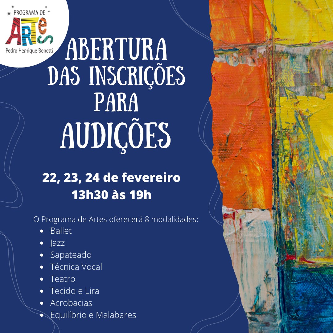 O Programa de artes, reconhecido pela comunidade gramadense por formar novos artistas, abrirá inscrições para as audições entre os dias 22, 23 e 24 de fevereiro, das 13h30 às 19h, na Sala de Convivência da Sede do Programa, no Expogramado.