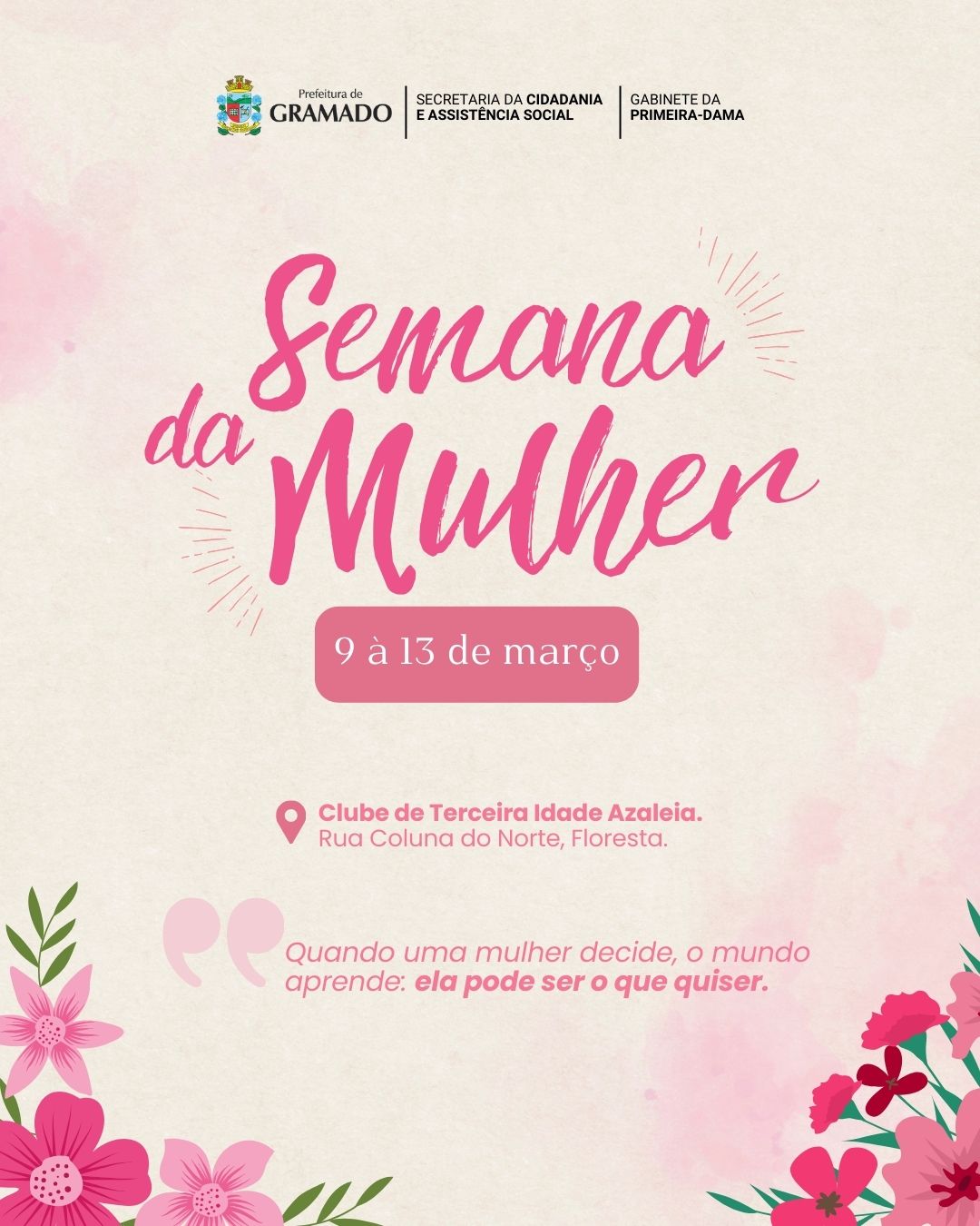 A Prefeitura de Gramado, por meio da Secretaria da Cidadania e Assistência Social, em uma ação conjunta com o Gabinete da Primeira-Dama, realiza entre os dias 9 e 13 de março uma programação especial alusiva à Semana da Mulher. O evento, que terá como sede o Clube da Terceira Idade Azaleia (Rua Coluna do Norte, no bairro Floresta), busca promover a convivência, o fortalecimento de vínculos e o bem-estar das mulheres da comunidade.