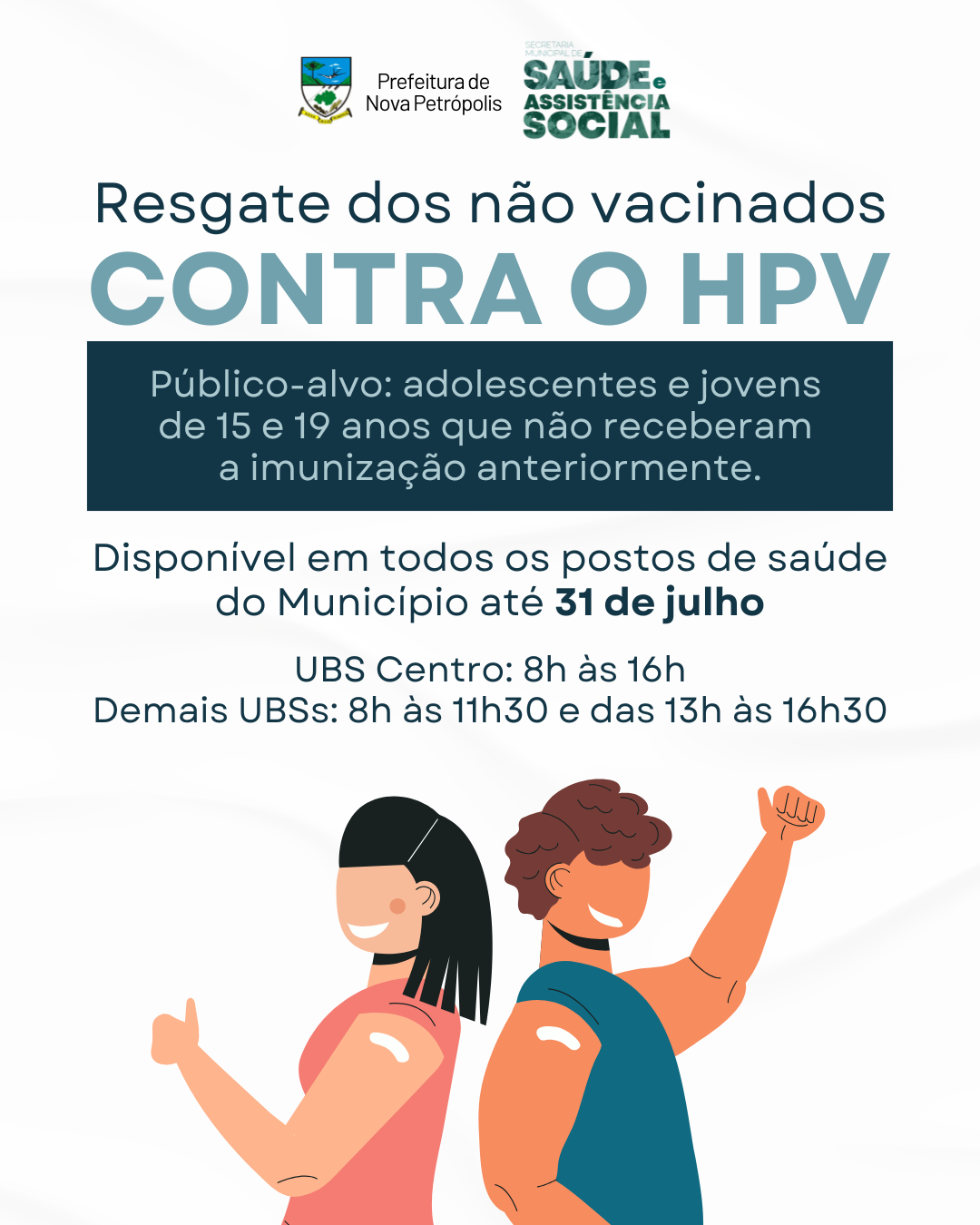 A Prefeitura de Nova Petrópolis, por meio da Secretaria Municipal de Saúde e Assistência Social, informa que adolescentes e jovens entre 15 e 19 anos que ainda não se vacinaram contra o HPV terão uma nova oportunidade para se proteger. A imunização está disponível gratuitamente em todas as Unidades Básicas de Saúde (UBSs) de Nova Petrópolis, até 31 de julho, de segunda a sexta-feira. O público-alvo poderá se vacinar na UBS Centro, das 8h às 16h, e nas demais UBSs, das 8h às 11h30 e das 13h às 16h30. A vacina também será ofertada no dia 10 de maio, próximo sábado, das 8h às 17h, em todas as UBSs do Município.