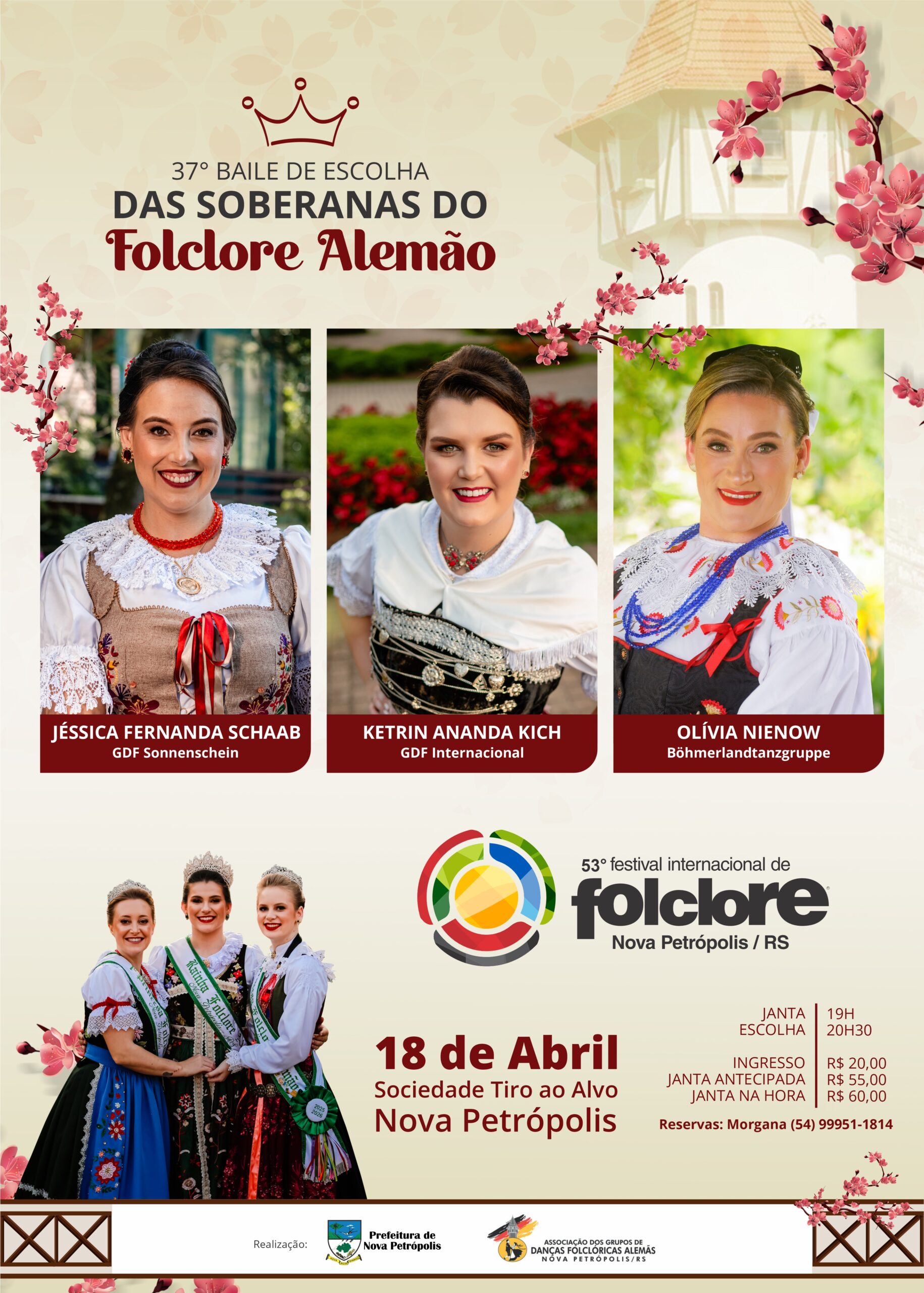 O 37º Baile de Escolha das Soberanas do Folclore Alemão de Nova Petrópolis será realizado no dia 18 de abril, sábado, na Sociedade Cultural e Recreativa Tiro ao Alvo. Três candidatas concorrem ao título de Rainha e Princesas do Folclore Alemão. A corte eleita representará o maior evento cultural da Serra Gaúcha, o 53ºFestival Internacional de Folclore, que ocorre em Nova Petrópolis, de 16 de julho a 2 de agosto de 2026.