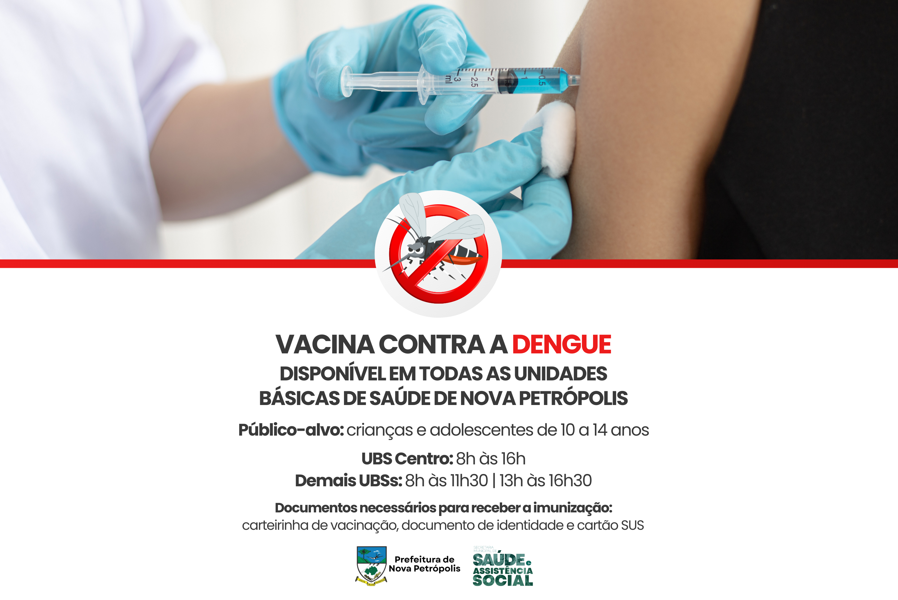 A Secretaria de Saúde e Assistência Social de Nova Petrópolis informa que a vacina contra a Dengue já está disponível em todas as Unidades Básicas de Saúde (UBSs) do Município. A imunização é destinada, exclusivamente, a crianças e adolescentes de 10 a 14 anos (14 anos, 11 meses e 29 dias). São duas doses, com intervalo de 90 dias entre elas. A vacinação ocorre de segunda a sexta-feira, das 8h às 16h na UBS do Centro, e das 8h às 11h30 e 13h às 16h30 nas demais UBSs. Para receber a vacina, os pais ou responsáveis devem apresentar carteirinha de vacinação, documento de identidade e cartão SUS da criança ou adolescente.