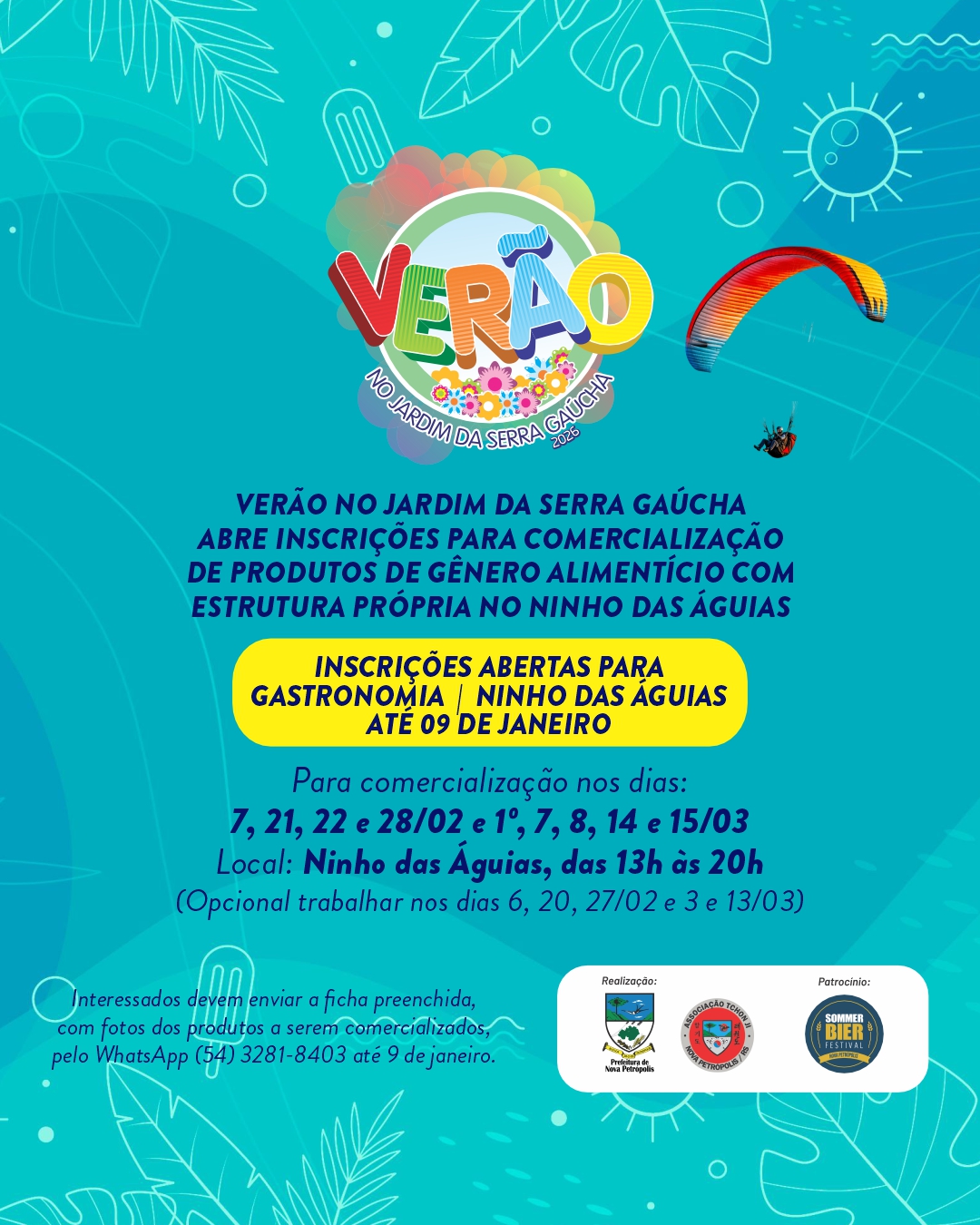 A Secretaria de Turismo e Cultura de Nova Petrópolis informa que as inscrições para comercialização de produtos de gênero alimentício, com estrutura própria, no Verão no Jardim da Serra Gaúcha 2026 estão abertas, e devem ser realizadas até o dia 9 de janeiro.
