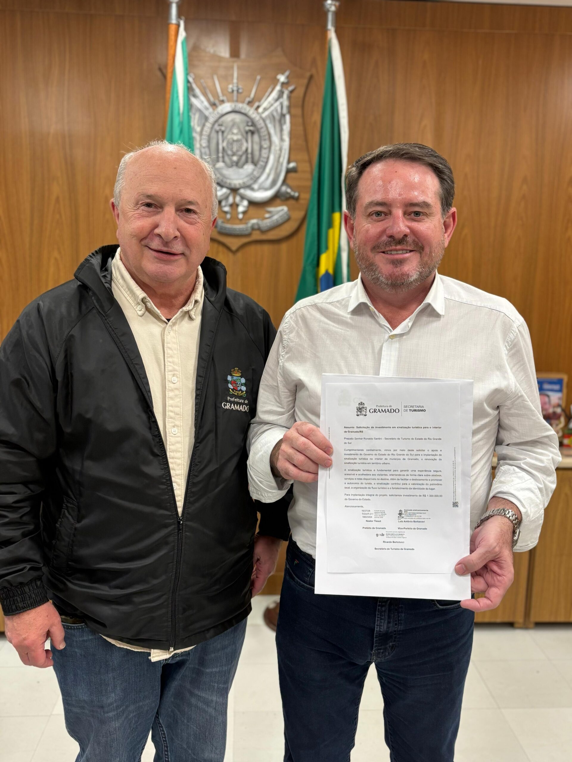 Entre as solicitações, estava a busca de recursos para investimentos em sinalização turística, tanto em vias urbanas como nas estradas do interior. “É extremamente necessário realizarmos uma revitalização completa das placas de sinalização. Gramado é um destino que recebe milhares de turistas brasileiros e estrangeiros, que necessitam destes equipamentos para orientar os deslocamentos até os nossos atrativos”, avalia o vice-prefeito Luia Barbacovi, lembrando que as placas também são fundamentais para orientação e segurança da comunidade local.